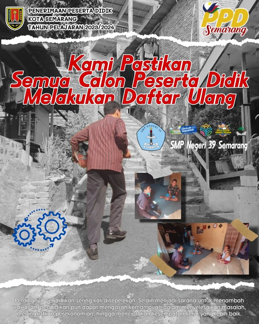 Panitia PPDB SMP Negeri 39 Semarang jemput bola untuk memastikan calon peserta didik mendapatkan haknya untuk bisa masuk sebagai peserta didik di SMP Negeri 39 Semarang 2023 - 2024. Selamat datang kepada peserta didik baru SMP Negeri 39 Semarang.