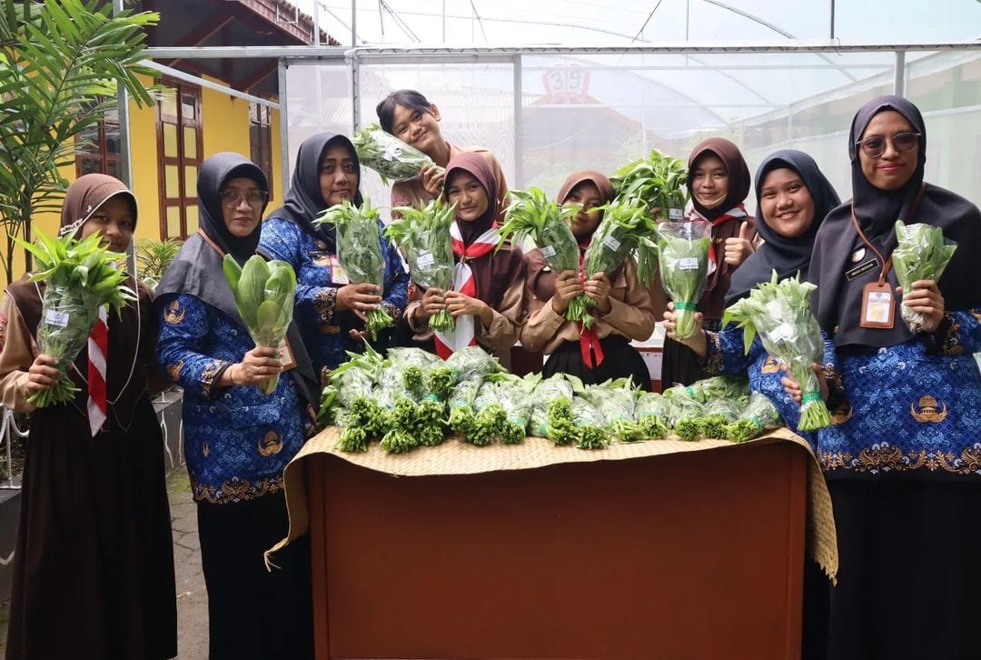 GURU dan siswa SMPN 39 Semarang antuasias terlibat panen raya kangkung.