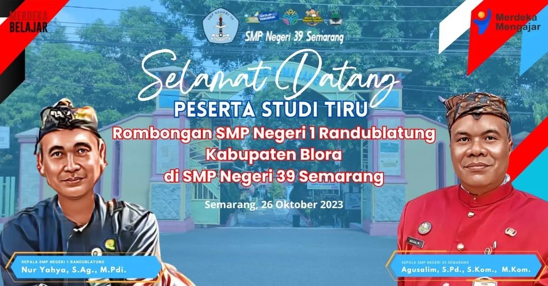Semarang, Kamis 26 Oktober 2023 SMPN 39 Semarang mendapat kunjungan dari SMPN 1 Randublatung Kabupaten Blora dalam rangka Study Tiru. Dalam Study Tiru tersebut Kepala SMPN 1 Randublatung Ibu Nur Yahya S.Ag., M.Pd.I membawa sebanyak 50 orang, yang terdiri dari 45 guru dan 5 tenaga kependidikan. Study Tiru ini dilakukan dalam rangka berbagi antar komunitas, organisasi atau instansi, yang memiliki tujuan untuk meniru pengalaman atau keterampilan keberhasilan prestasi yang diraih instansi/ tempat yang telah dikunjungi.